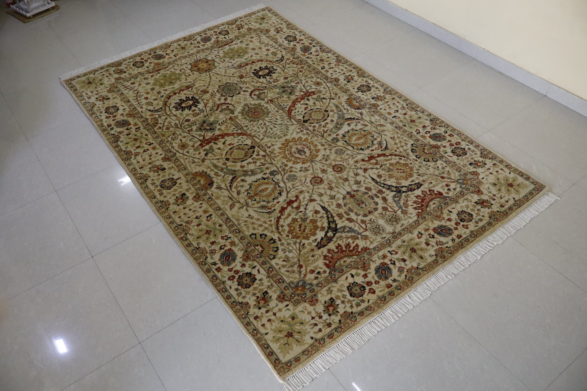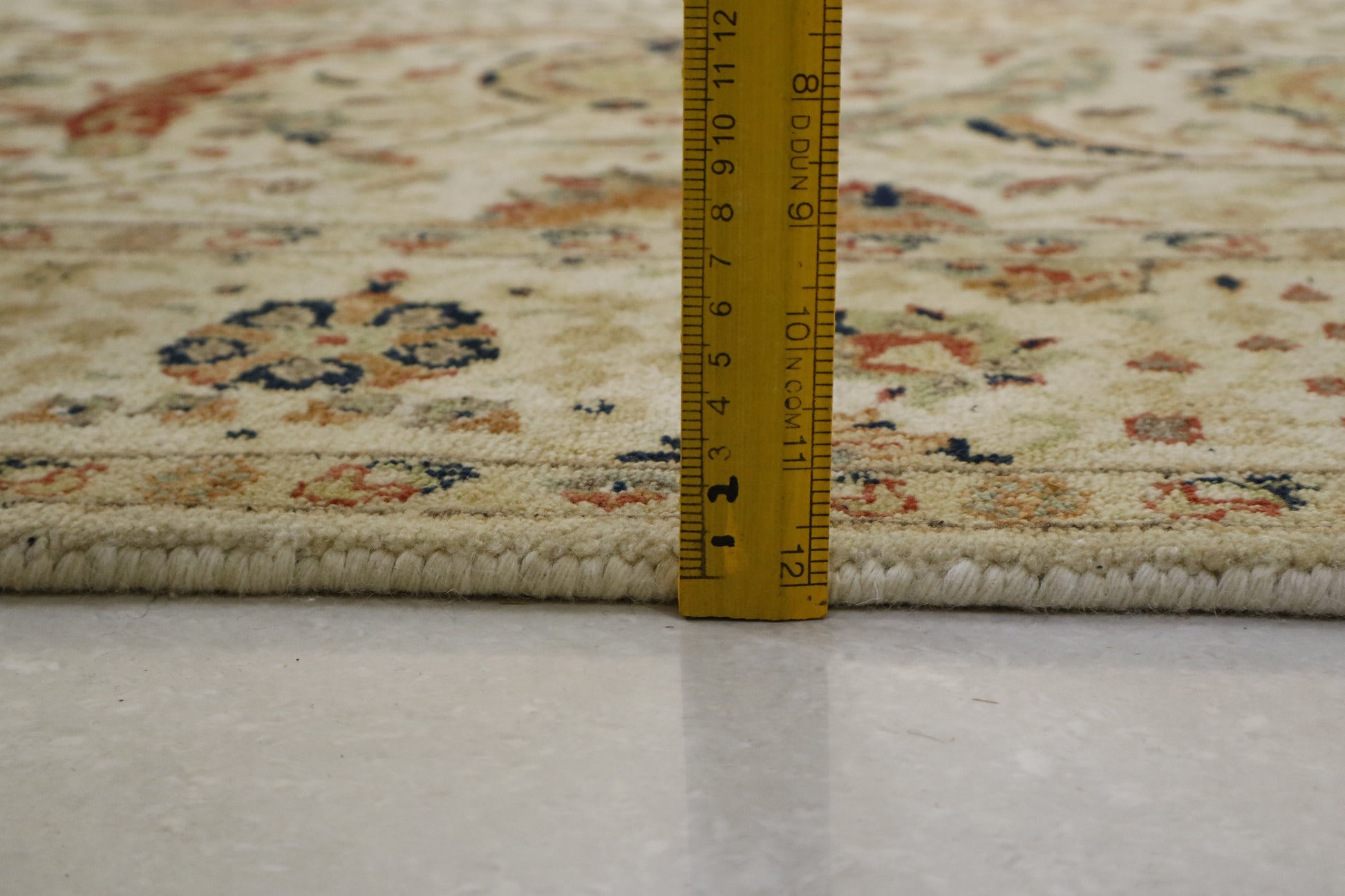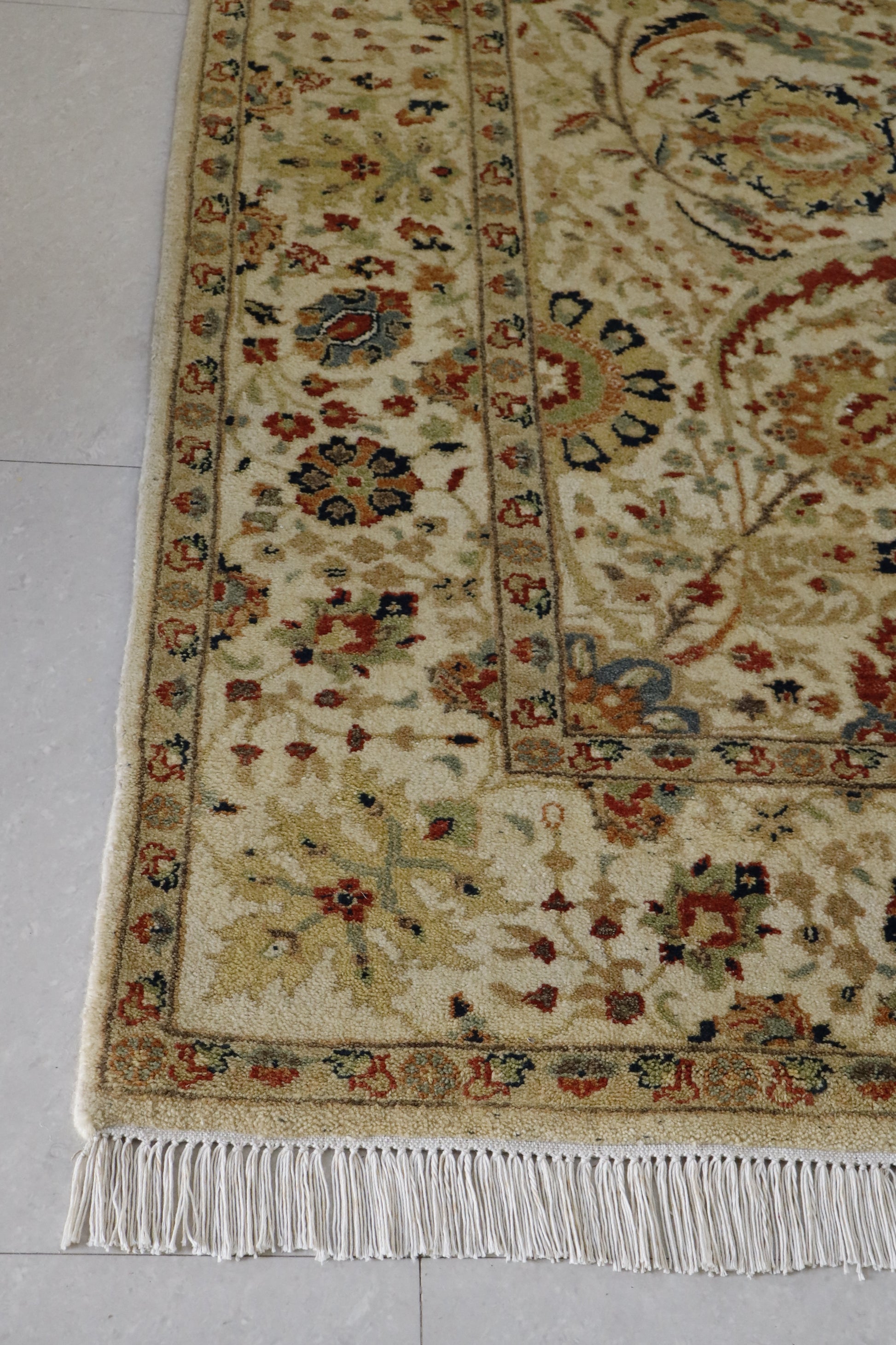 This beautiful area carpet features a soft beige background adorned with a sophisticated array of intricate floral and vine motifs. At the center, a classic medallion design is framed by radiating petals and ornate details, giving the piece a refined sense of symmetry. The warm color palette, with shades of golden brown, sage green, subtle blue, and burgundy, effortlessly blends traditional Persian artistry with modern appeal.The detailed floral patterns and delicate medallion highlight skilled craftsmanship and cultural heritage, making the carpet a versatile addition to both contemporary and traditional interiors. Its neutral tones and timeless botanical design evoke tranquility, while the premium quality fabric provides durability and underfoot comfort. This carpet is perfect for elevating living spaces, bedrooms, or dining areas, bringing charm and sophistication to any home